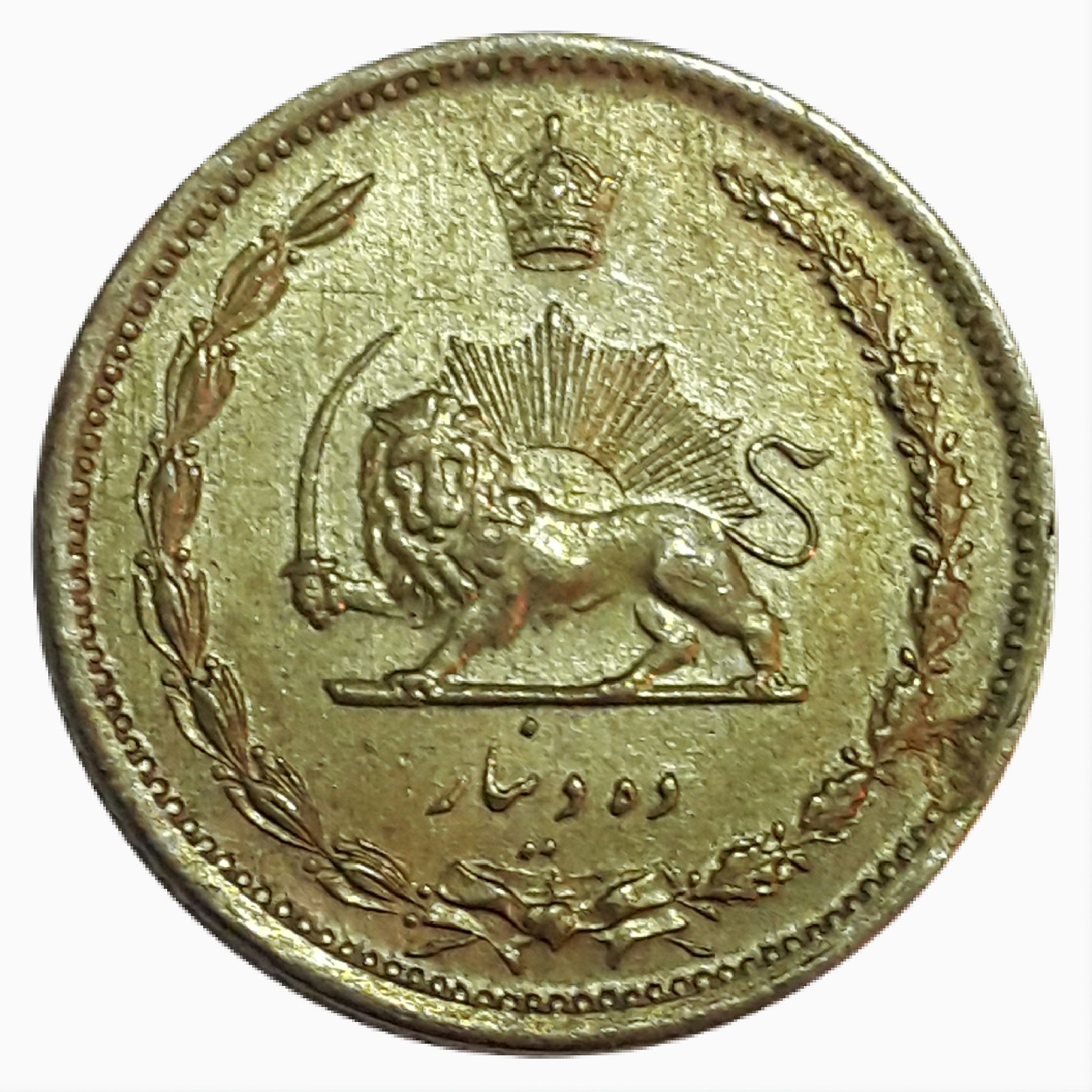 | شرح پشت :برگ بلوط و زیتون – تاج – شیر و خورشید – مبلغ به حروف | Reverse : Oak and Olive leaves, Crown, Lion & Sun, value in word |
