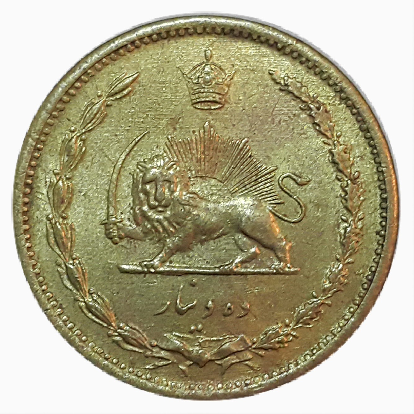 | شرح پشت :برگ بلوط و زیتون – تاج – شیر و خورشید – مبلغ به حروف | Reverse : Oak and Olive leaves, Crown, Lion & Sun, value in word |