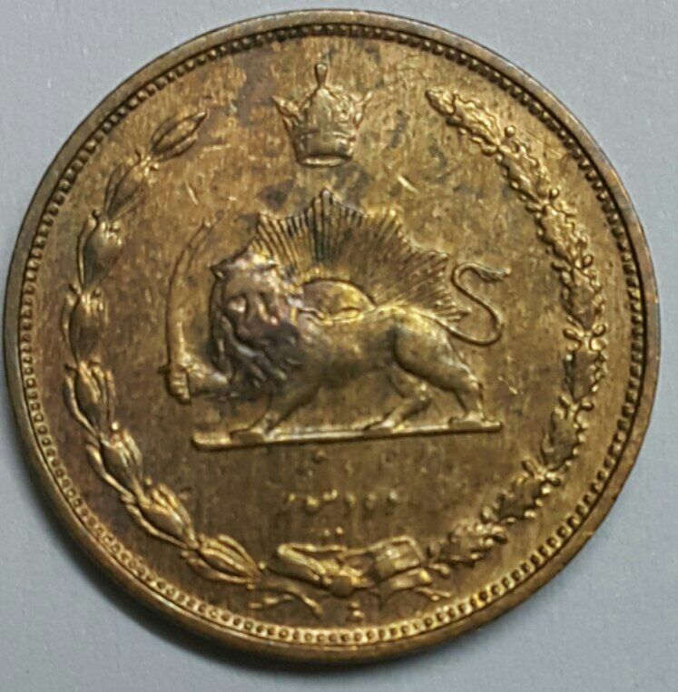 شرح پشت : برگ بلوط و زیتون – تاج – شیر و خورشید- و مبلغ به حروف Reverse : Oak and Olive leaves, Crown, Lion & Sun, value in word
