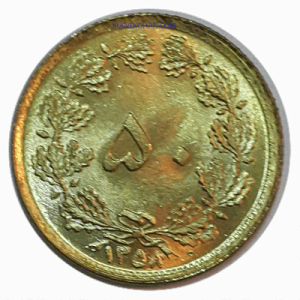 شرح پشت : برگ بلوط و زیتون – تاج – شیر و خورشید- و مبلغ سکه Reverse : Oak and Olive leaves, Crown, Lion & Sun, value