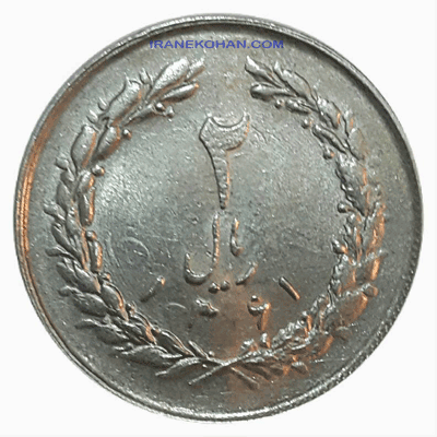 | شرح رو : برگ بلوط و زیتون -تاج-محمدرضا پهلوی- مبلغ عدد – سال ضرب | Obverse : Oak and olive leaves – crown-MohammadReza Shah Pahlavi-Value- date |