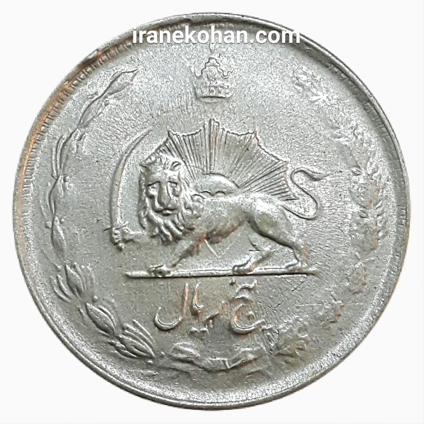 | شرح رو : برگ بلوط و زیتون -تاج-محمدرضا پهلوی- مبلغ عدد – سال ضرب | Obverse : Oak and olive leaves – crown-MohammadReza Shah Pahlavi-Value- date |